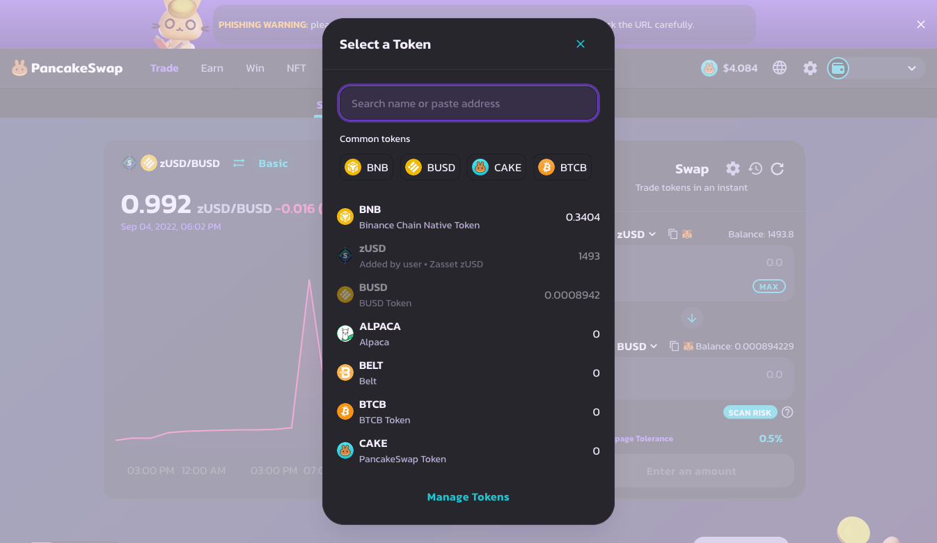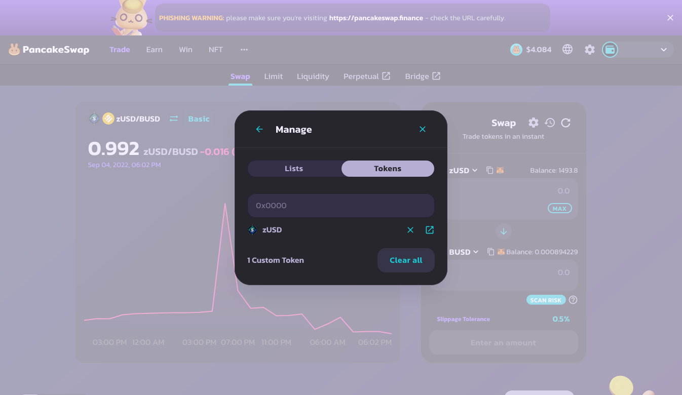 <figure><img src="https://1857084827-files.gitbook.io/~/files/v0/b/gitbook-x-prod.appspot.com/o/spaces%2F046WMf85TR5jMSeCkPEl%2Fuploads%2FS4eVHXMPg8TkwKKC1INy%2FzUSD-BUSD_2_PancakeSwap_Swap_Settings2.png?alt=media&#x26;token=e2e5c3aa-040f-4636-9bac-a5c13a0cf3b5" alt=""><figcaption><p>Swap Settings - In case zUSD is not showing up, click "Manage Tokens".</p></figcaption></figure>