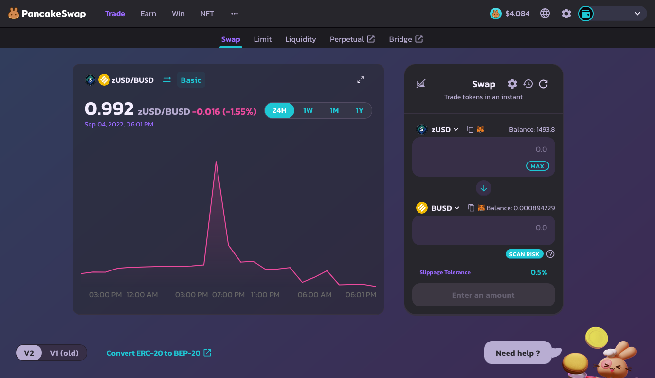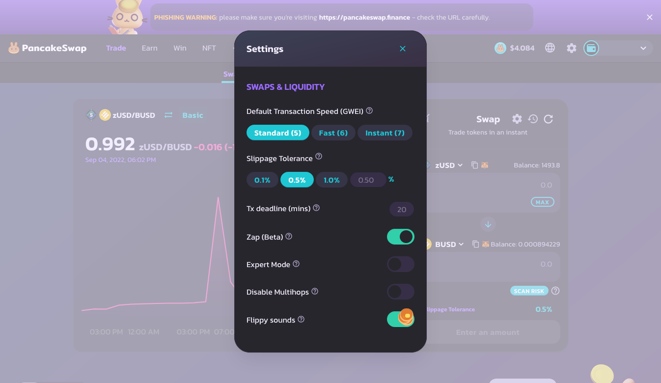 <figure><img src="https://1857084827-files.gitbook.io/~/files/v0/b/gitbook-x-prod.appspot.com/o/spaces%2F046WMf85TR5jMSeCkPEl%2Fuploads%2F7K3cPIh4ssMRA7kLza9m%2FzUSD-BUSD_2_PancakeSwap_Swap_Settings1.png?alt=media&#x26;token=ddca63f9-0837-4c0f-bdc4-b3f498ab3777" alt=""><figcaption><p>Swap Settings - Consider Slippage tolerance.</p></figcaption></figure>