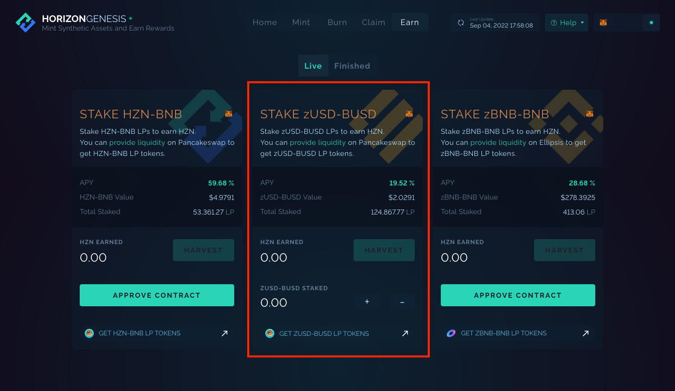 <figure><img src="https://1857084827-files.gitbook.io/~/files/v0/b/gitbook-x-prod.appspot.com/o/spaces%2F046WMf85TR5jMSeCkPEl%2Fuploads%2FZKy4BdOL3x5533ZIwhNt%2FzUSD-BUSD_1_horizon_genesis_earn_tab.png?alt=media&#x26;token=4288096a-3465-471c-a591-cdd7b9b2d272" alt=""><figcaption></figcaption></figure>