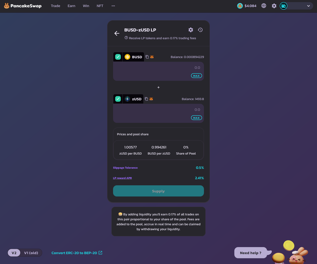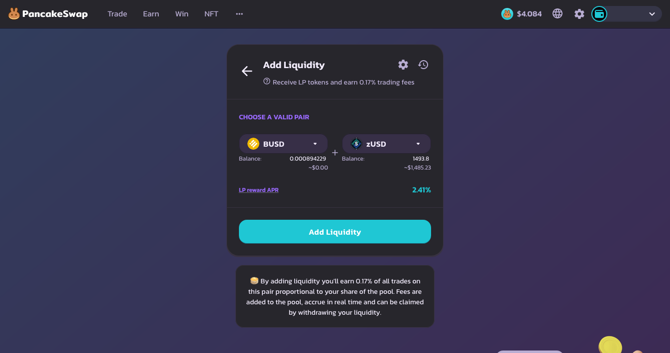 <figure><img src="https://1857084827-files.gitbook.io/~/files/v0/b/gitbook-x-prod.appspot.com/o/spaces%2F046WMf85TR5jMSeCkPEl%2Fuploads%2FzbUeqz4IYPCd9xTRHh05%2FzUSD-BUSD_2_PancakeSwap_Add_Liquidity.png?alt=media&#x26;token=2f8ef919-3c83-41fd-957c-1c8c9b42b2e9" alt=""><figcaption><p>Add Liquidity Page.</p></figcaption></figure>