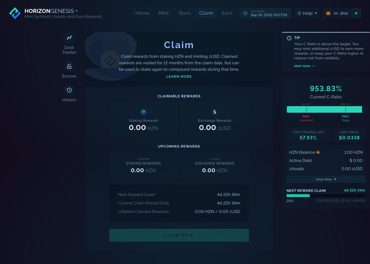 And this is what your Claim page will look like after (basically, you didn't click "Claim Now" because your Upkeep claimed for you). Note that the Upkeep can only Claim when you have the proper C-Ratio. The Upkeep currently cannot auto-burn for you.