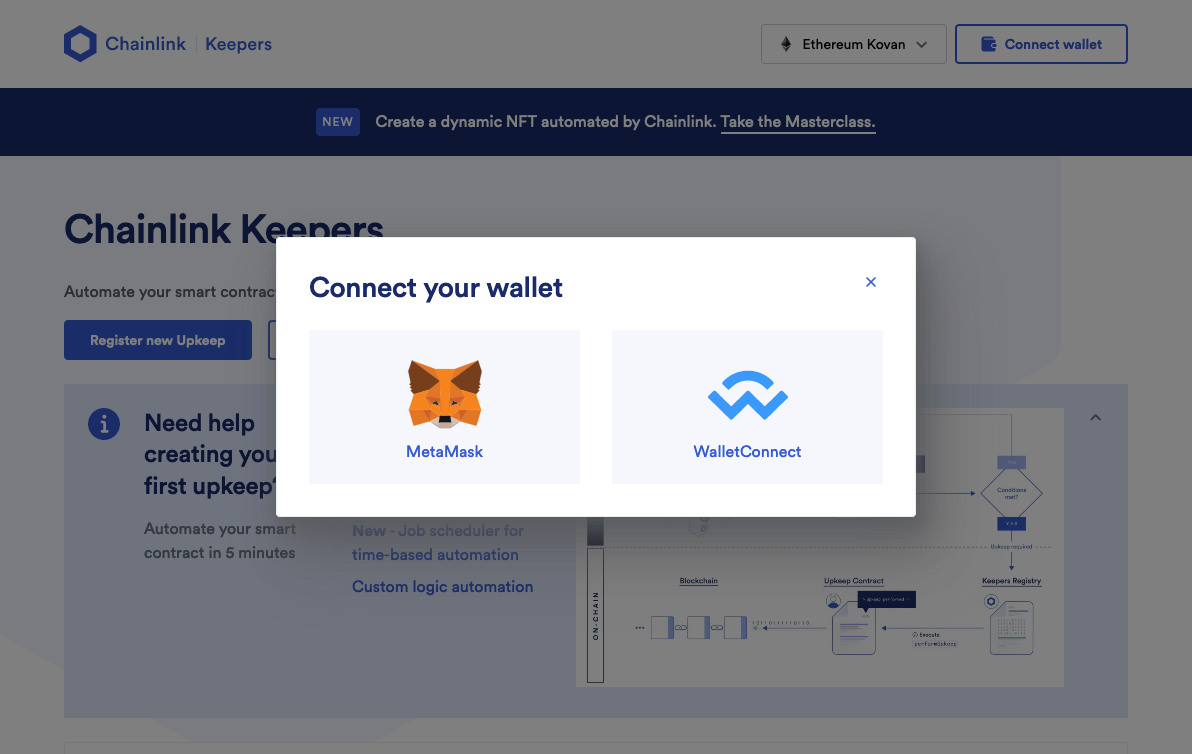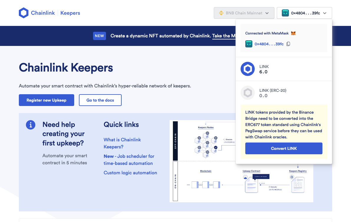 After connecting, you should be able to click on your wallet to confirm that you already have LINK tokens ready. Next, click "Register new Upkeep" to get started.