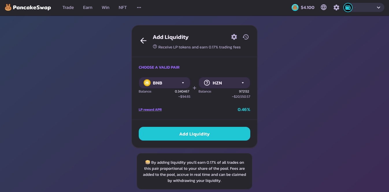 The following is a guide on how to add liquidity in the HZN-BNB pool in the Earn tab to earn yield.