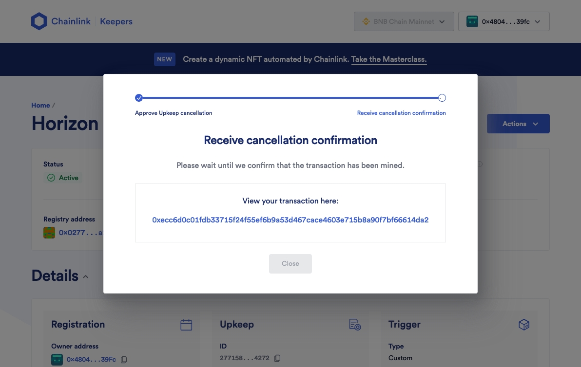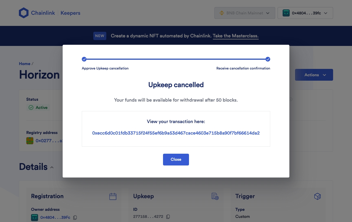 The final step is for canceling Upkeeps. Canceling your Upkeep consists of two parts: