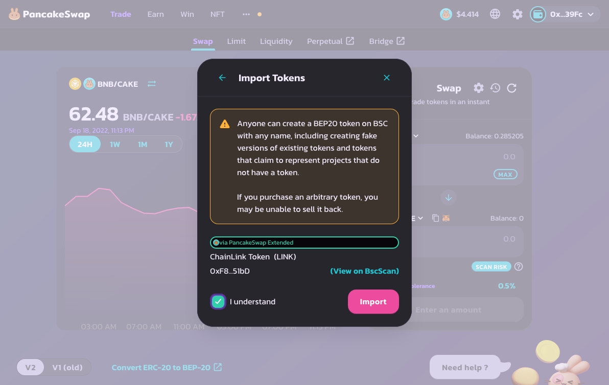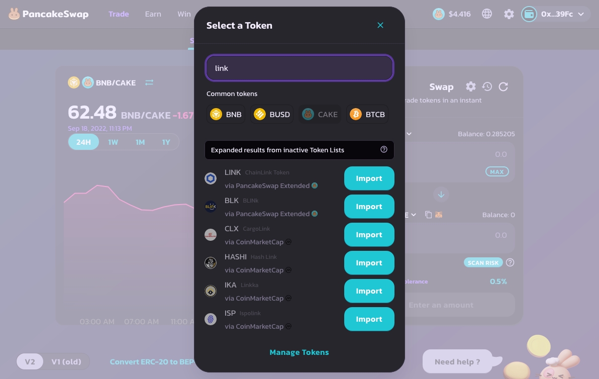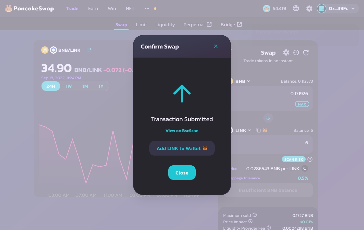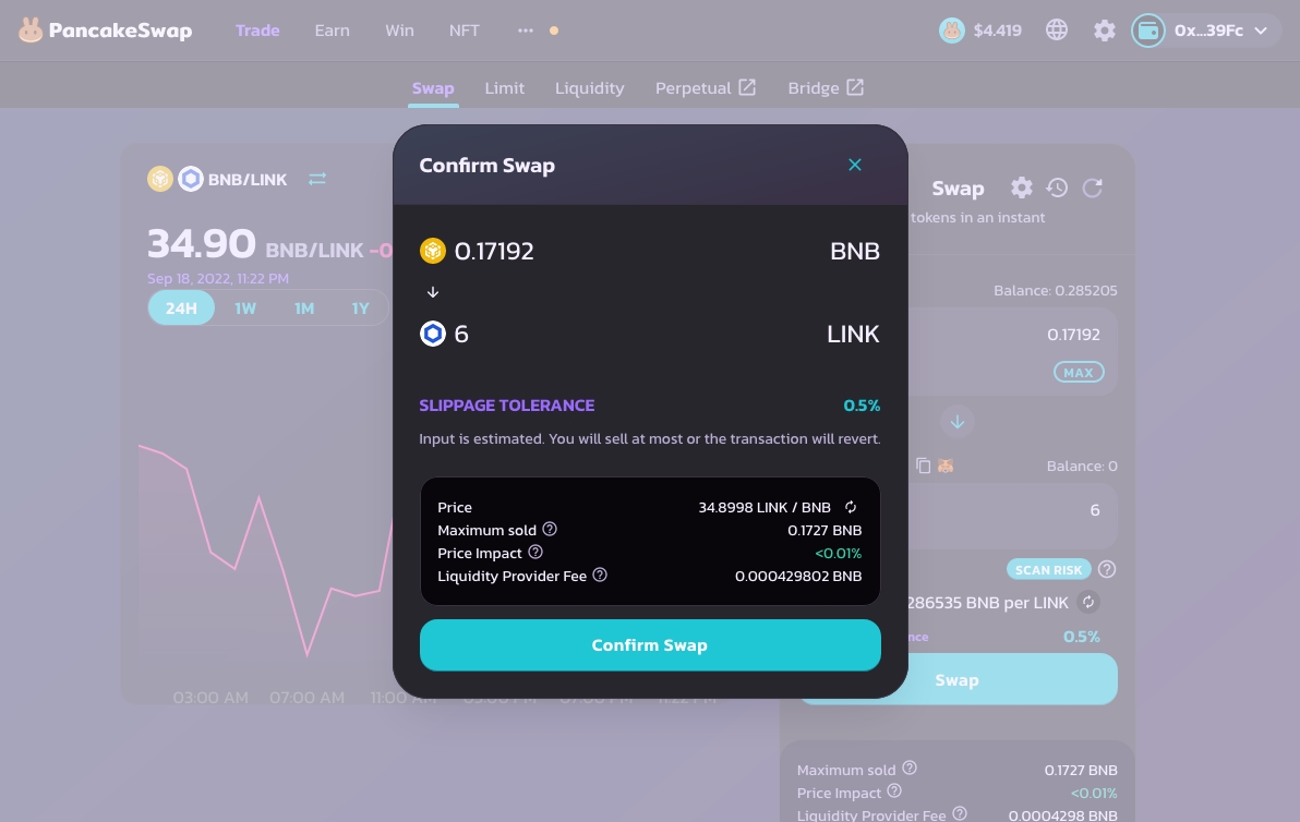 The screenshots below will focus on using PancakeSwap to buy LINK BEP-20 tokens:
