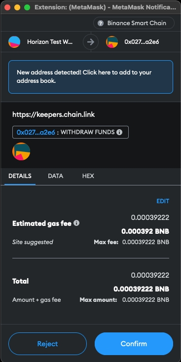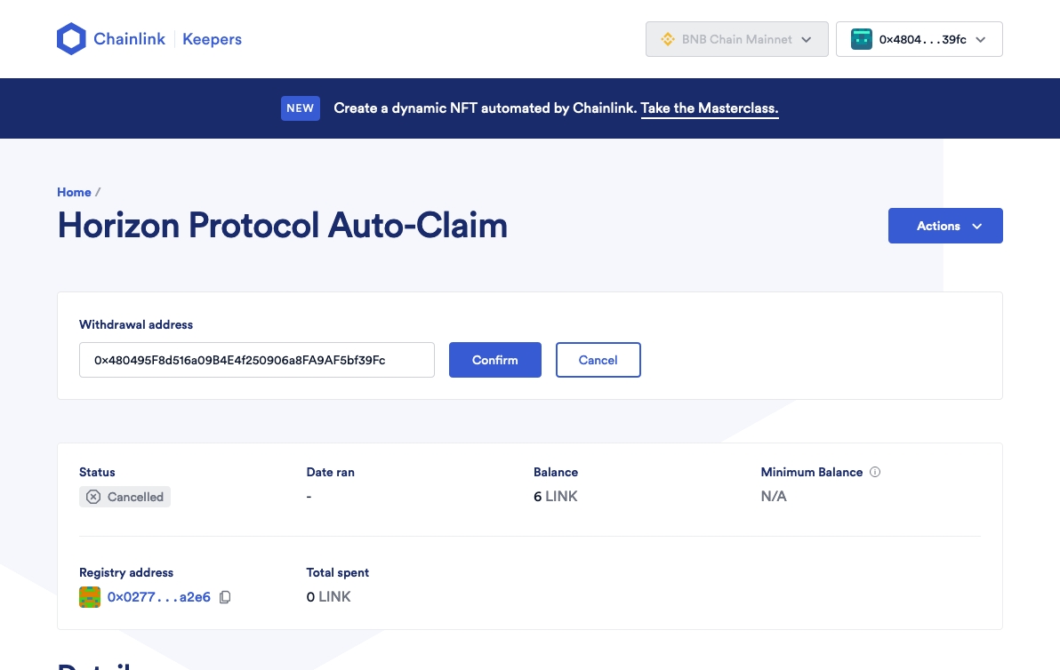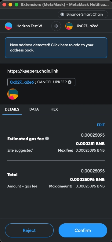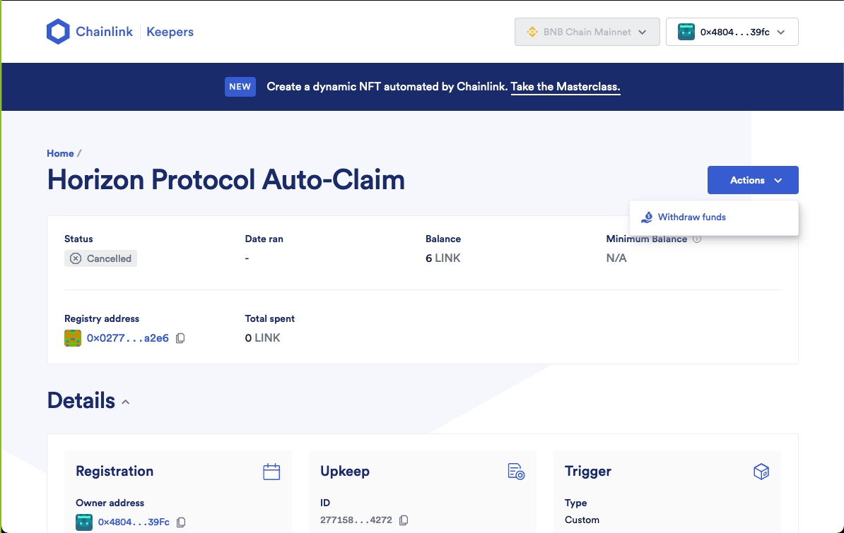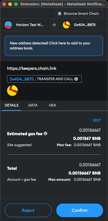 If you are buying LINK tokens on a CEX, such as Binance, make sure you are withdrawing the LINK onto the BNB Chain (BEP-20 token) and not withdrawing onto the Ethereum chain (ERC-20 token). Since the Chainlink Automation upkeep is operating on the BNB Chain for Horizon Protocol, it must be a BEP-20 LINK token.
