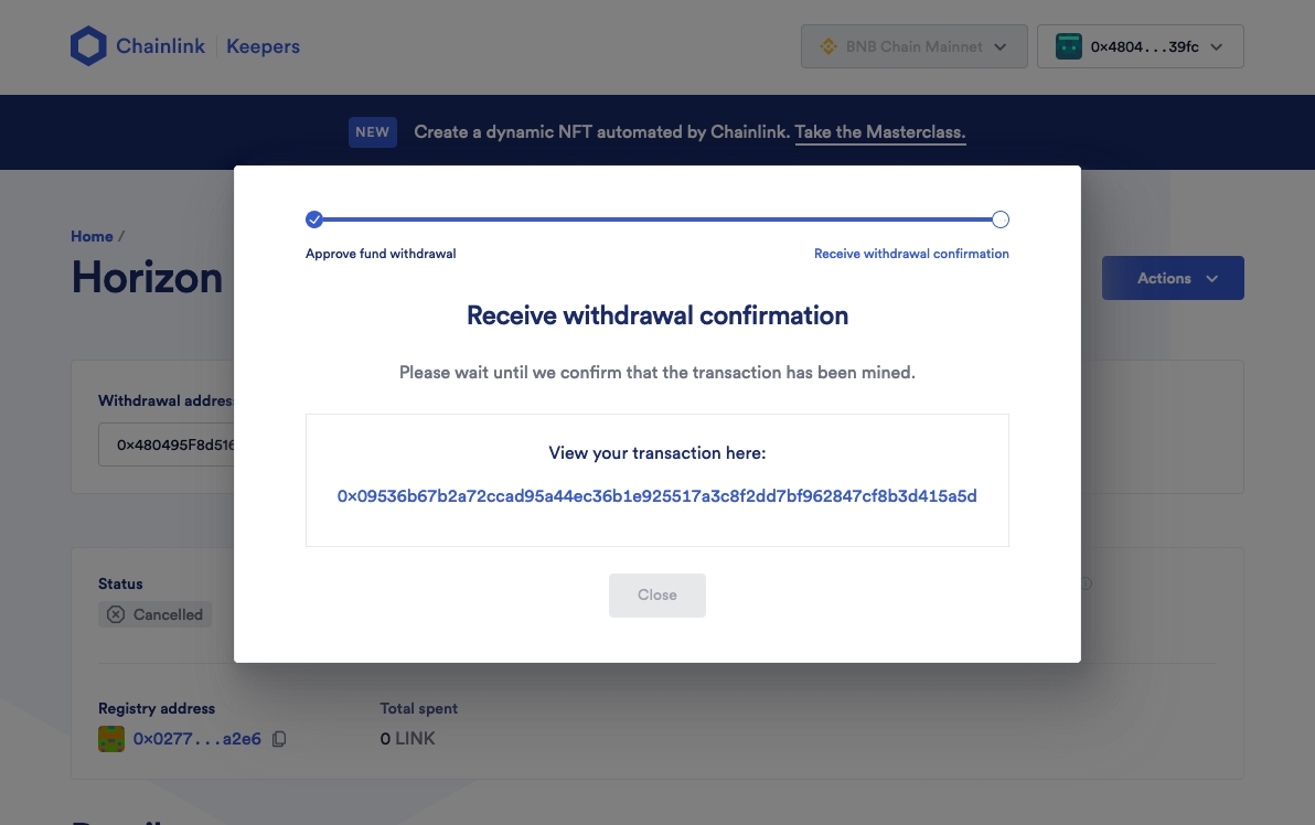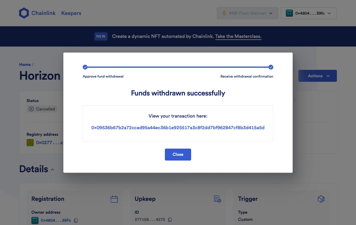 The process for Cancel Upkeep and Withdraw Funds will lose you a bit of LINK (in this case, we went from 6 --> 5.9).