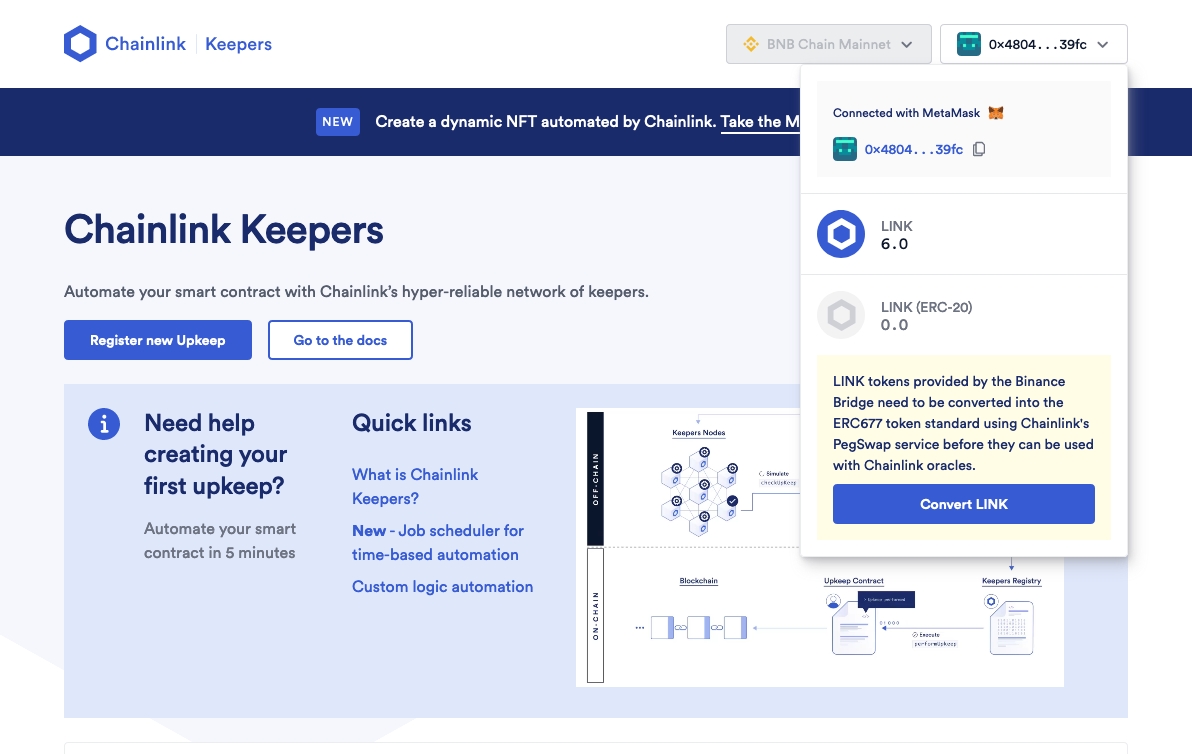 Step 0. Grant Contract Authorization Step 1. Get LINK BEP-20 Tokens Step 2. Convert LINK BEP-20 to BEP-677 Step 3. Register Upkeep Step 4. Auto-Claiming Optional Step 5. Canceling Your Upkeep