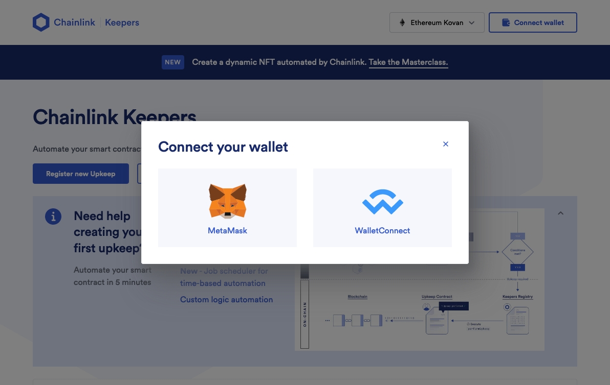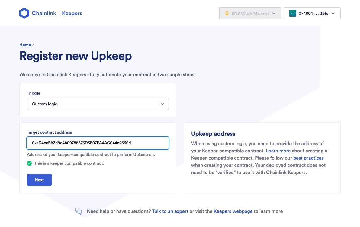 We can start this step by going back to https://automation.chain.link/bsc. Make sure your wallet is connected.