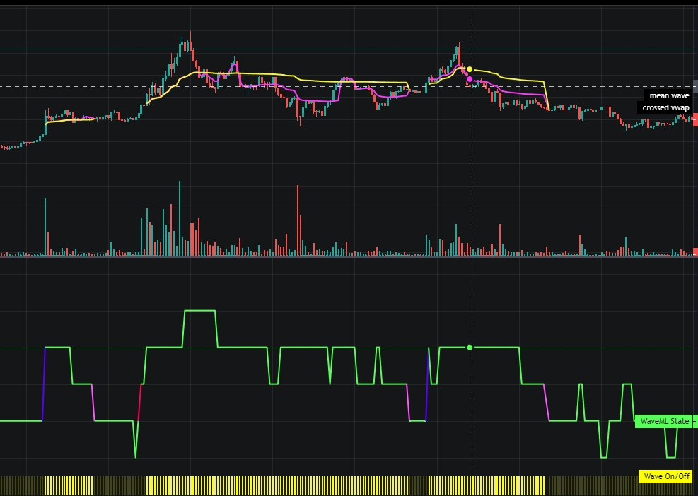 WaveVWAPCross Interpretation: The pink cross between WaveVWAP (yellow) and OHLC can help to time entries or exits by highlighting possible trend shifts, yet the direction post-cross depends on additional signals within WaveML and other indicators like WaveVWAP in dynamic support or resistance mode.
