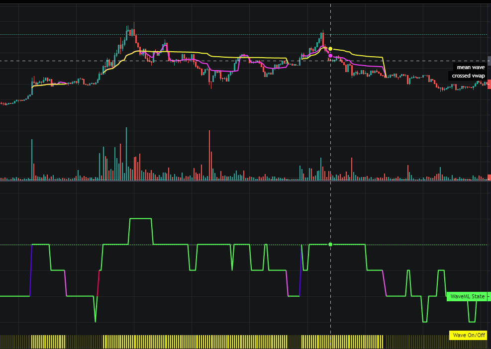 * **WaveVWAPCross Interpretation:** The pink cross between WaveVWAP (yellow) and OHLC can help to time entries or exits by highlighting possible trend shifts, yet the direction post-cross depends on additional signals within WaveML and other indicators like WaveVWAP in dynamic support or resistance mode.