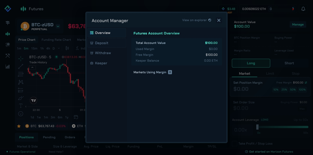 Deposit Margin - deposit the funds you want to use in Horizon Futures. Only the funds deposited can be used by FAMS. It cannot touch other assets in your wallet.
