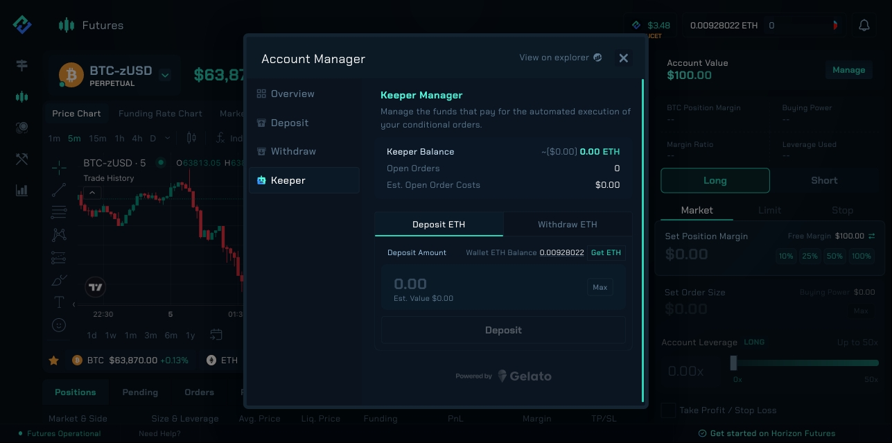 Fund Keeper - to access limit and stop-loss orders, the Keeper must be funded. The Keeper is what is used to automate and batch-execute multi-step operations on your behalf. Without funding the Keeper, you will be limited to just Market actions without Take Profit/Stop Loss orders.