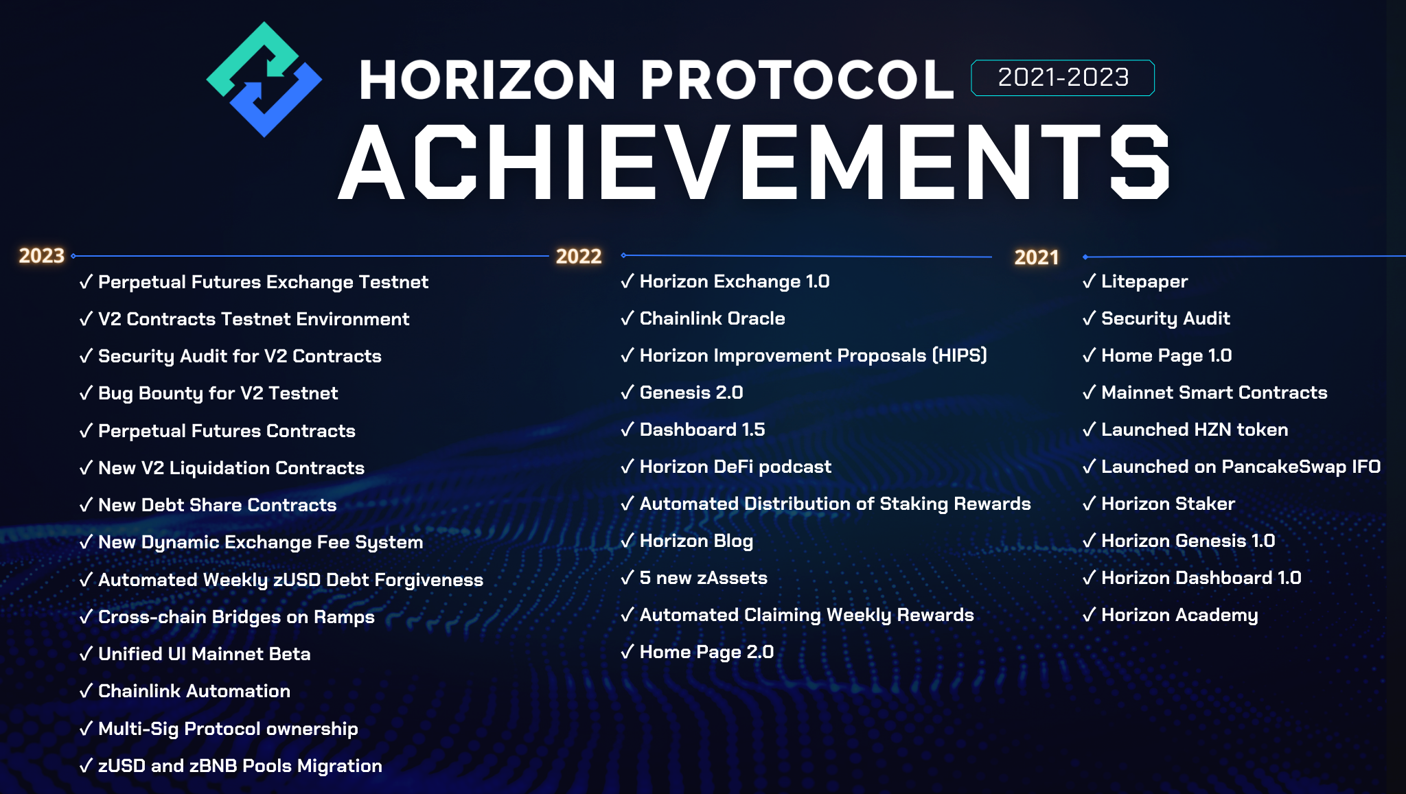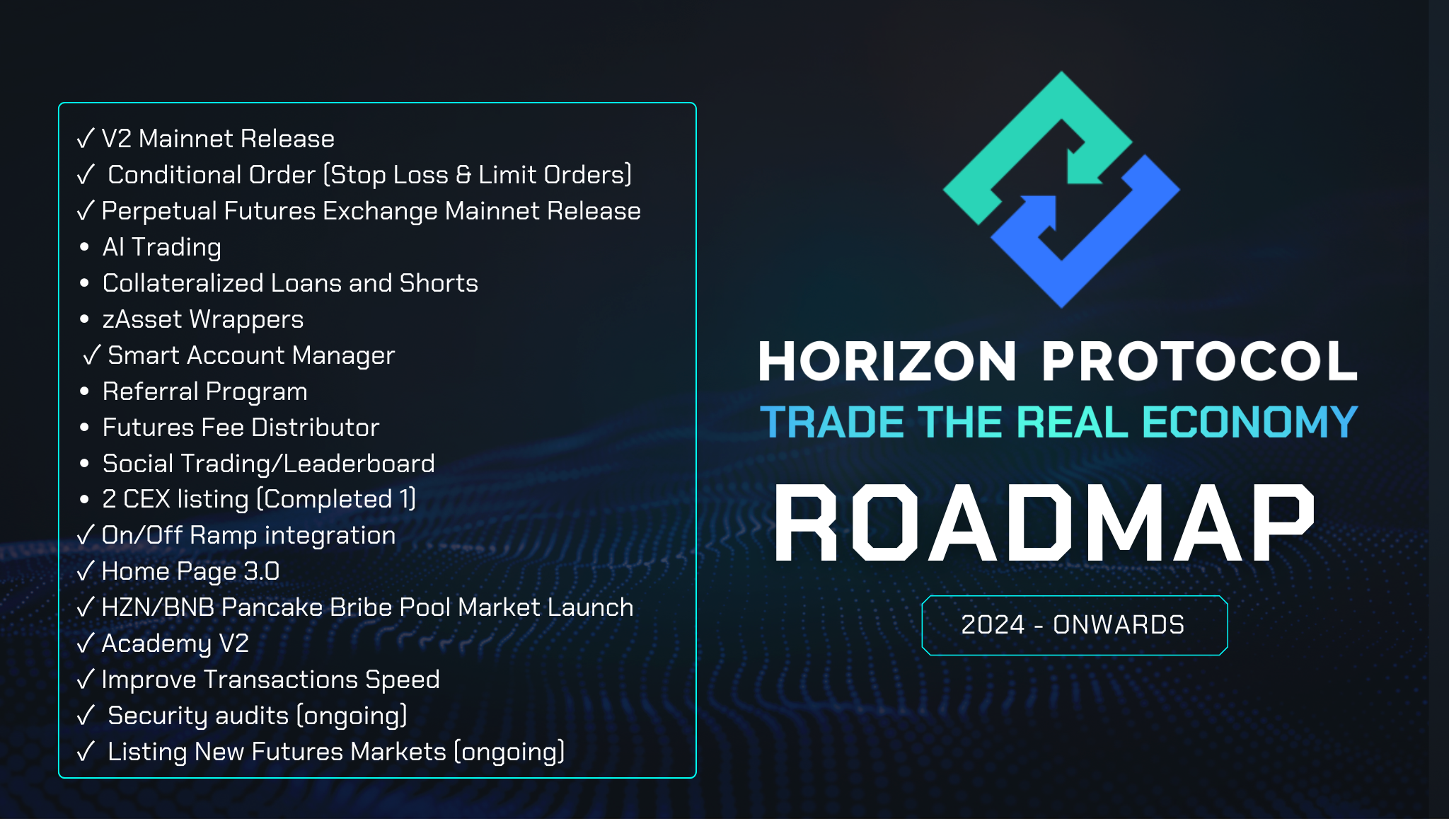 Our primary mission centers around providing the community with a derivative powerhouse with UI simplicity, ensuring everyone has the best user-experience that’s available on the market. This involves expanding derivative options such as futures/spot trading, staking, borrowing, hedging, diversifying portfolios, or introducing one-click arbitrage. The platform acts as a gateway, enabling users to access the real-world economy through secure and efficient synthetic assets. Additionally, we aim to enhance HZN accessibility through 2 centralized exchanges (CEX) listings for 2024 and fiat on/off ramps to ensure a smoother onboarding experience for users.
