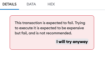 Questo passaggio comporta l'applicazione delle fee in BNB. Una volta cliccato su “Write” (Scrivi), il wallet dovrebbe aprirsi per confermare. Si noti che gli errori si verificano quando il conto che si sta liquidando non ha abbastanza HZN per essere liquidato o non è ancora pronto per la liquidazione. Se viene visualizzata una tariffa errata o un messaggio di errore (ad esempio, 0,4 BNB non è corretto. Dovrebbe essere più vicino a 0,004 BNB), significa che non c'è abbastanza da liquidare. Di seguito è riportata un'immagine di un messaggio di errore di MetaMask:<br>