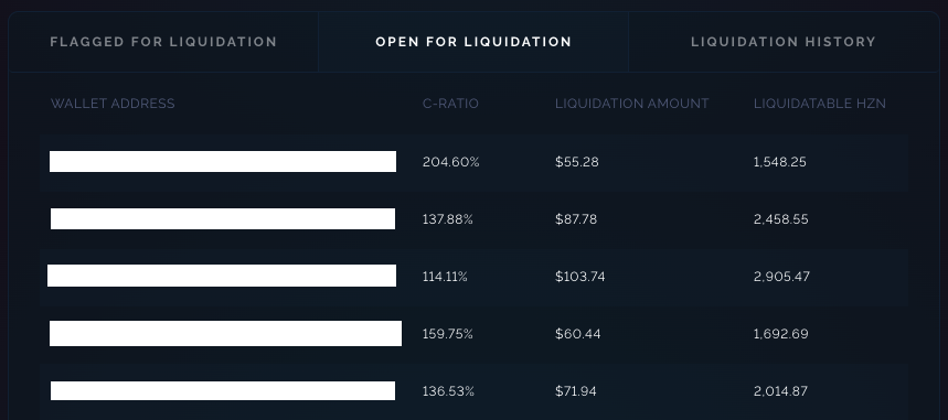 Una volta che un utente viene segnalato per la liquidazione e non ripristina il suo C-Ratio e cancella il flag, apparirà in un elenco di conti disponibili per essere liquidati ([sarà visibile a breve insieme alla quantità di zUSD necessaria per coprire la sua posizione fino a un C-Ratio del 700%](https://dashboard.horizonprotocol.com/)). Da qui, un liquidatore con sufficienti zUSD può liquidare questi conti e richiedere il rimborso di HZN con un bonus del 10%.