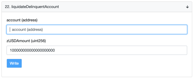 Scorrete fino a "22. liquidateDelinquentAccount". Alla voce "conto (indirizzo)", copiate l'indirizzo che state cercando di liquidare (trovato al punto 1 di Horizon Dashboard). In zUSDAmount (uint256), digitare l'importo in USD con 18 0 dopo. Ad esempio, $1 zUSD = 1000000000000000000. La schermata ha 20 0, quindi rappresenta 100 dollari zUSD.<br>