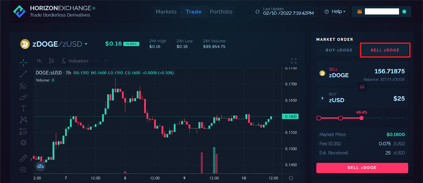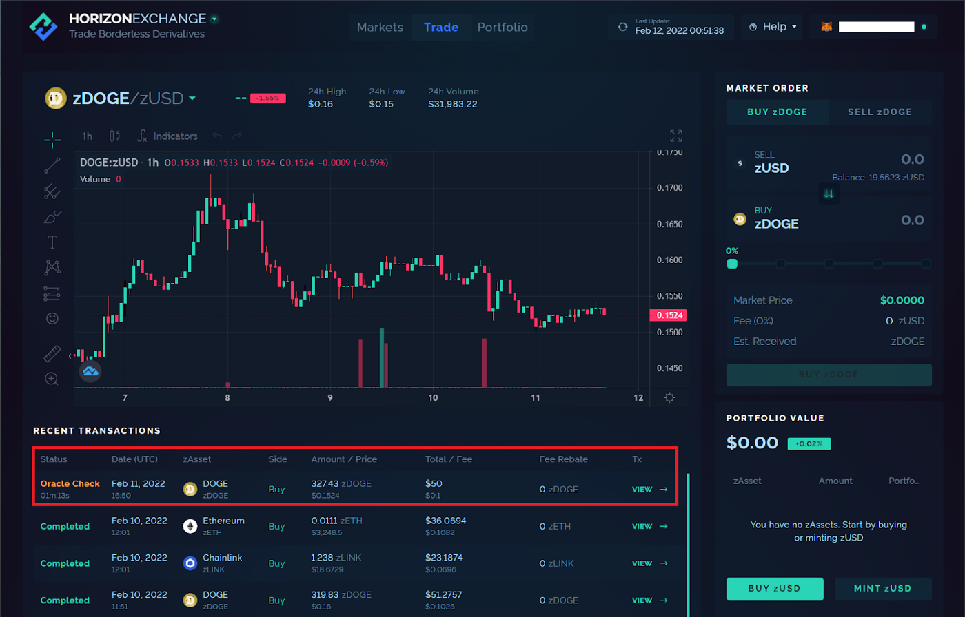 На вкладке " Trade" вы можете покупать и продавать zAssets! Попробуйте выбрать zAsset, которым вы хотите торговать, в данном руководстве мы будем использовать zDOGE. Вы можете использовать график TradingView, чтобы облегчить принятие решения.