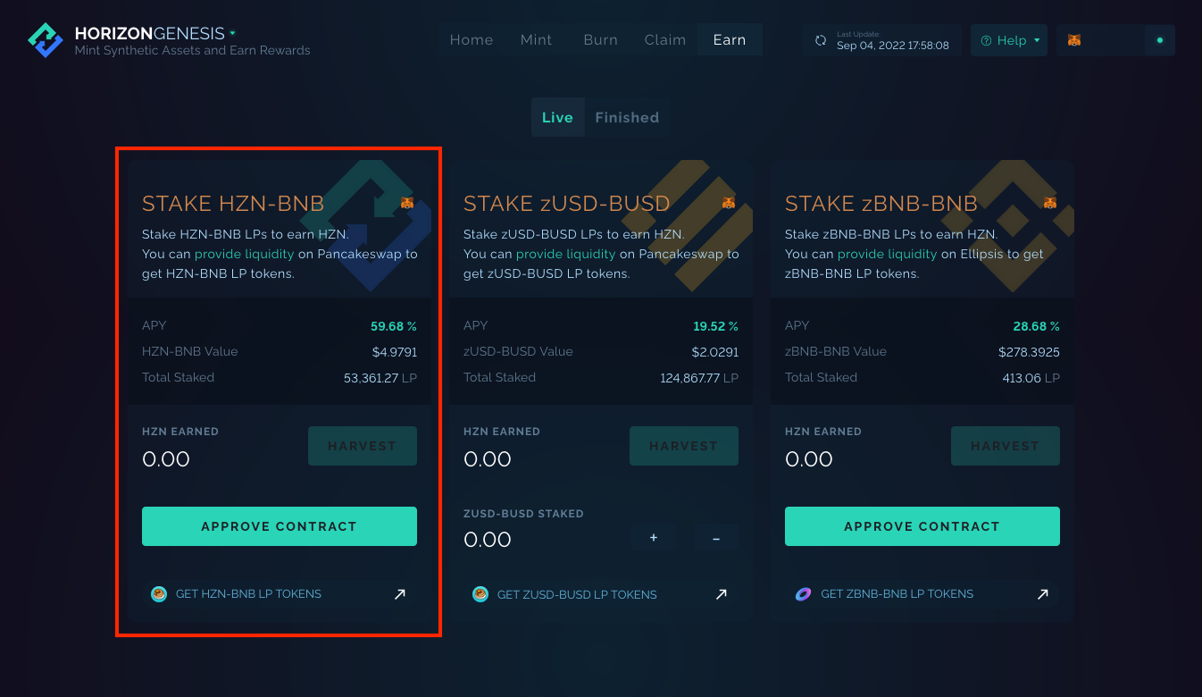 Ниже приводится руководство по добавлению ликвидности в пул HZN-BNB на вкладке " Earn" для получения доходности.