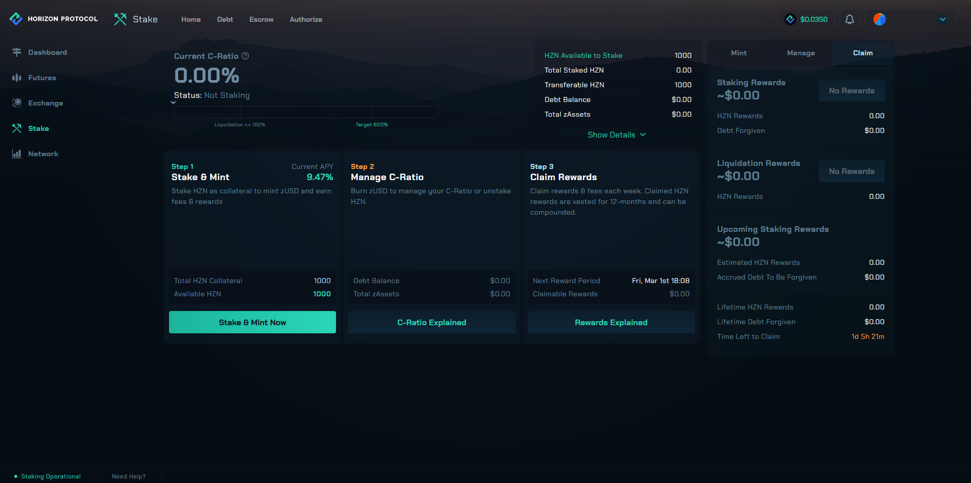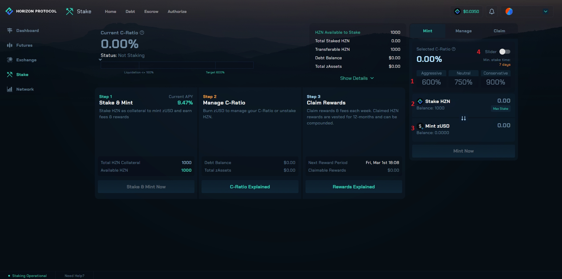 After connecting your wallet, you are ready to stake. Minting means you will be staking your HZN to create zUSD. The maximum amount of zUSD you can mint is at a 600% C-Ratio, which means that for every $600 USD worth of HZN, you will be able to mint $100 zUSD.