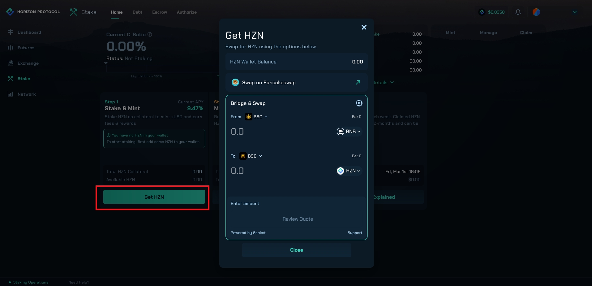 Alternatively, you can also swap other tokens for HZN through our integrated bridge (powered by Socket). You will find all the options available by clicking on the "Get HZN" button on the staking page.