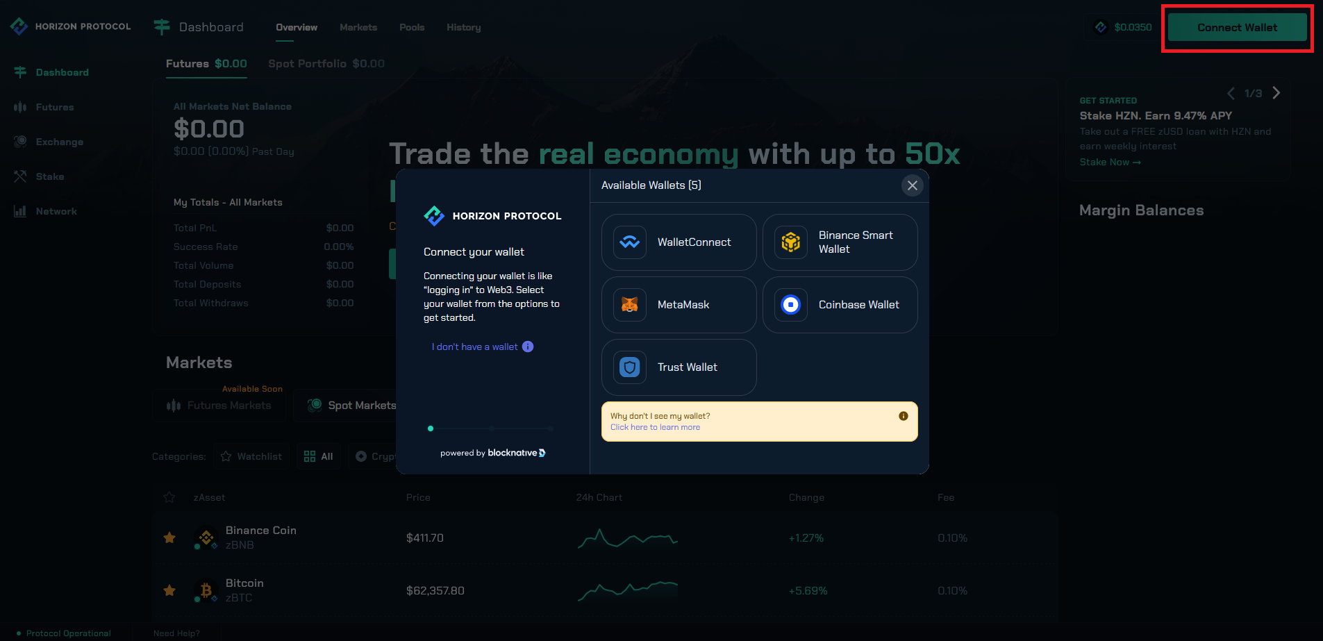 Visit [Horizon Protocol](https://app.horizonprotocol.com/) and connect your wallet by clicking on the top right corner and selecting your preferred wallet if you haven't already.