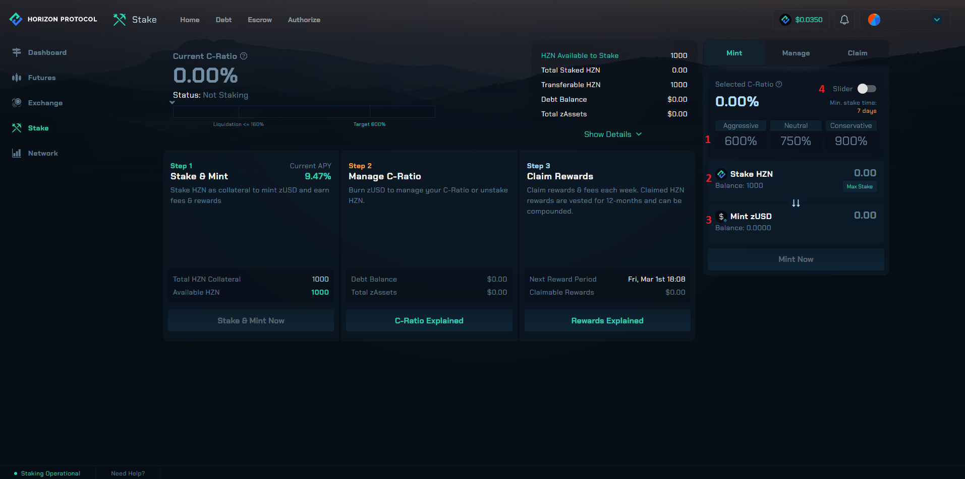 You can choose how much you want to Mint by selecting a preset strategy. **Aggressive** will populate the maximum amount of zUSD that is mintable, given your HZN holdings. **Neutral** and **Conservative** helps create a bit of a buffer so zUSD does not need to be as frequently burnt or HZN added to maintain the 600% C-Ratio. Learn more about [strategies](https://academy.horizonprotocol.com/stake-and-earn/staking-on-horizon-genesis/c-ratio-strategies).