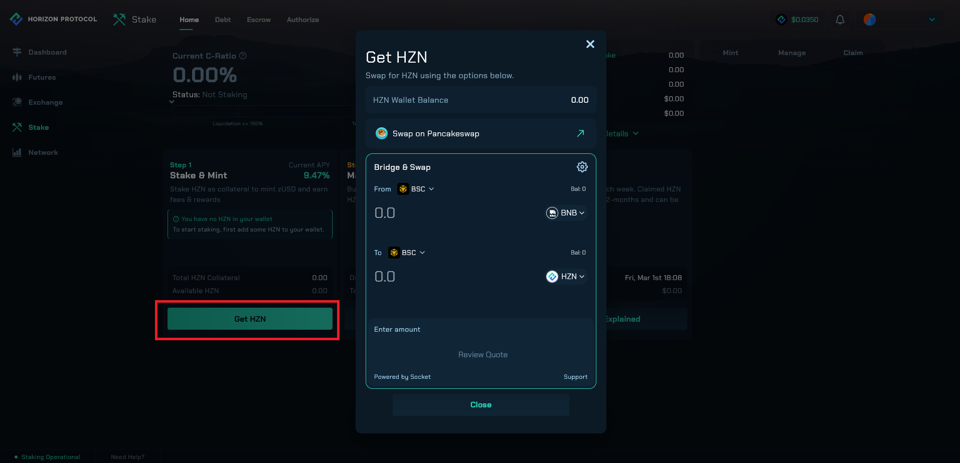 Alternatively, you can also swap other tokens for HZN through our integrated bridge *(powered by Socket)*. You will find all the options available by clicking on the "Get HZN" button on the [staking page](https://app.horizonprotocol.com/stake/home).