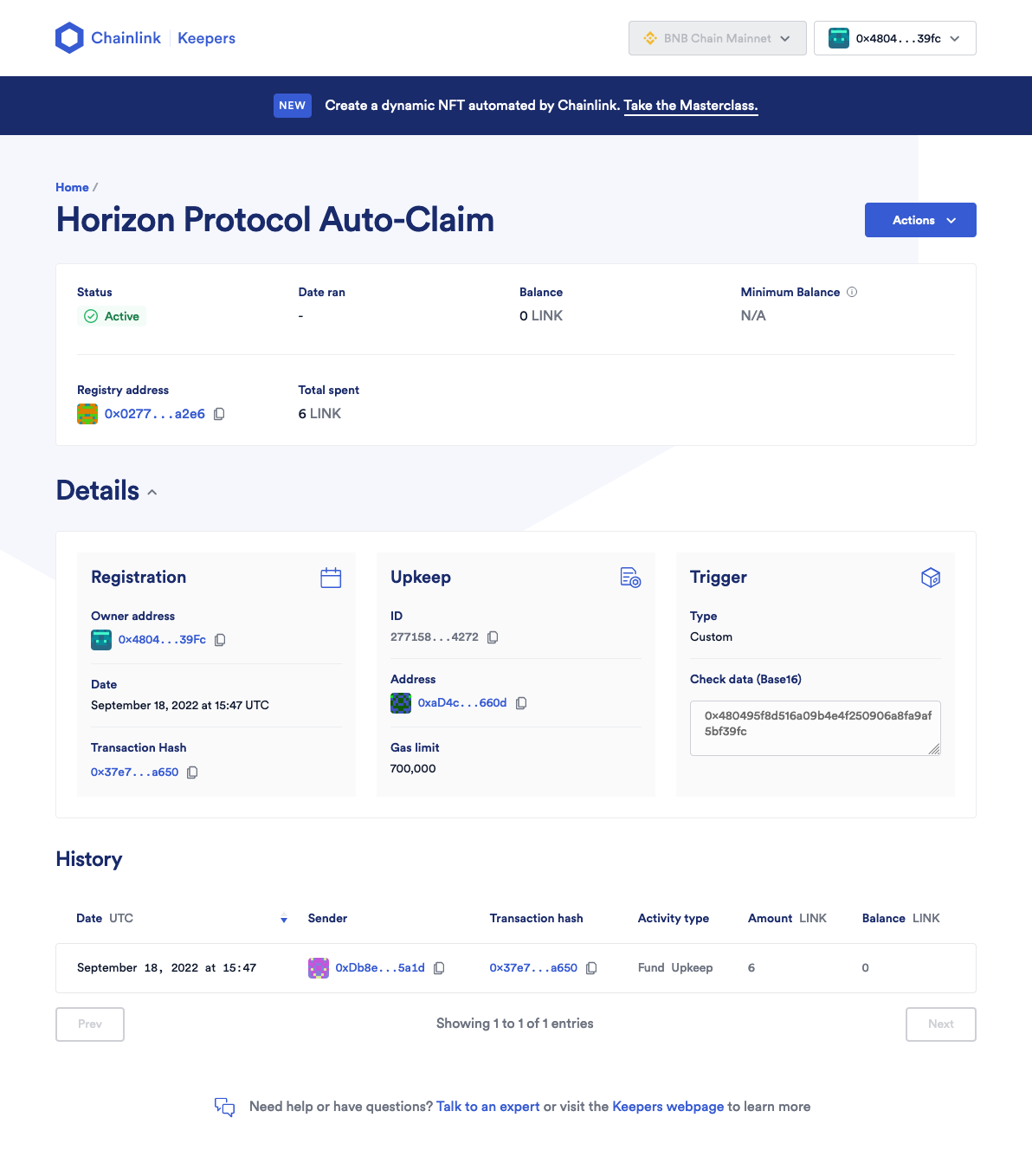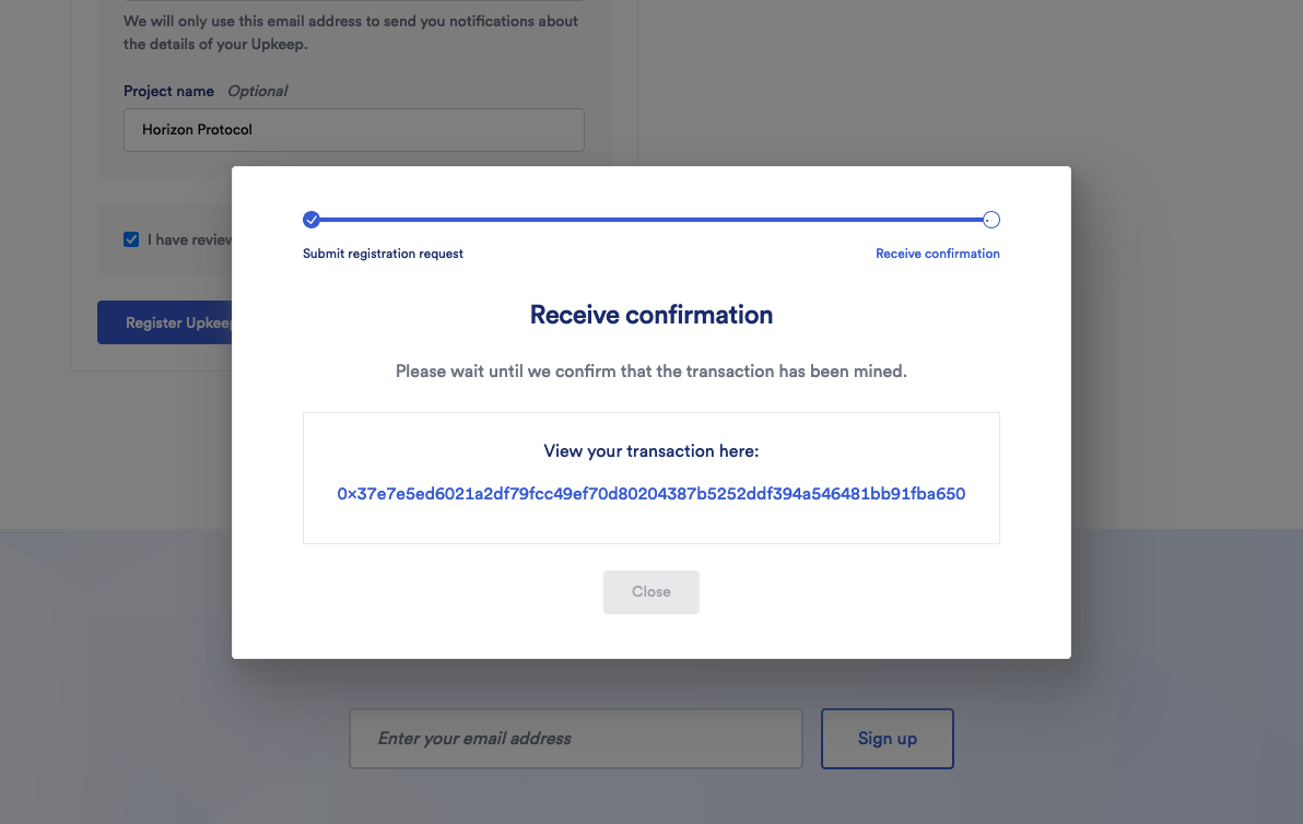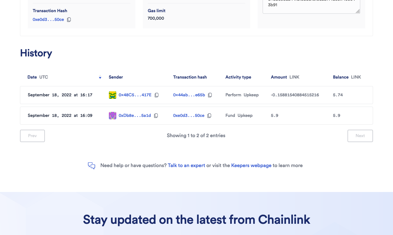 <figure><img src="https://content.gitbook.com/content/BrNnH1lxpRlQwwFmJoqL/blobs/3wIDNUnit7cMXnTuo79H/3_Register_Keepers_17.png" alt=""><figcaption><p>Once confirmed, the Upkeep page will look like this. Please wait until the transaction is confirmed.</p></figcaption></figure>