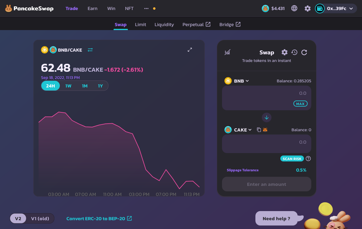 <figure><img src="https://content.gitbook.com/content/BrNnH1lxpRlQwwFmJoqL/blobs/4qOWipjVKyyqUaS9i8Zb/1_Get_LINK_BEP-20_Tokens_03.png" alt=""><figcaption><p>Connect your wallet to PancakeSwap. Click on "CAKE" on the right side Swap section of the page to open the modal.</p></figcaption></figure>
