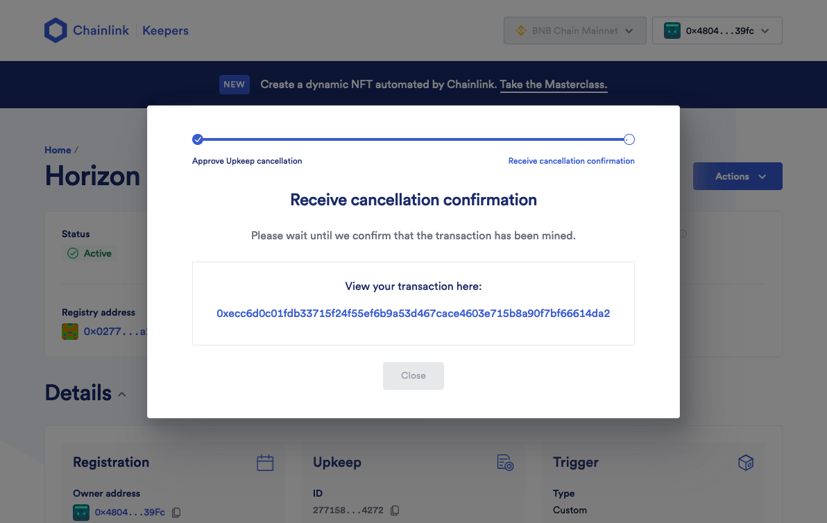 <figure><img src="https://content.gitbook.com/content/BrNnH1lxpRlQwwFmJoqL/blobs/y1plS4njkNLZoFJCRvor/5_Cancel_Keepers_04.png" alt=""><figcaption><p>Transaction confirmation that upkeep is cancelled.</p></figcaption></figure>