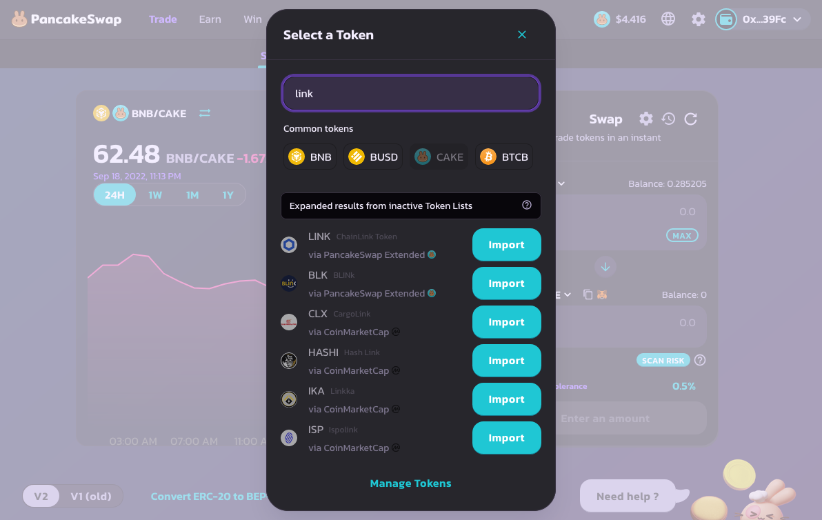 <figure><img src="https://content.gitbook.com/content/BrNnH1lxpRlQwwFmJoqL/blobs/CpYVVq0WmsHMxFjJWVM1/1_Get_LINK_BEP-20_Tokens_04.png" alt=""><figcaption><p>Find the LINK token. You can access this modal by clicking on a token on the Swap screen. Search for LINK. Click Import.</p></figcaption></figure>
