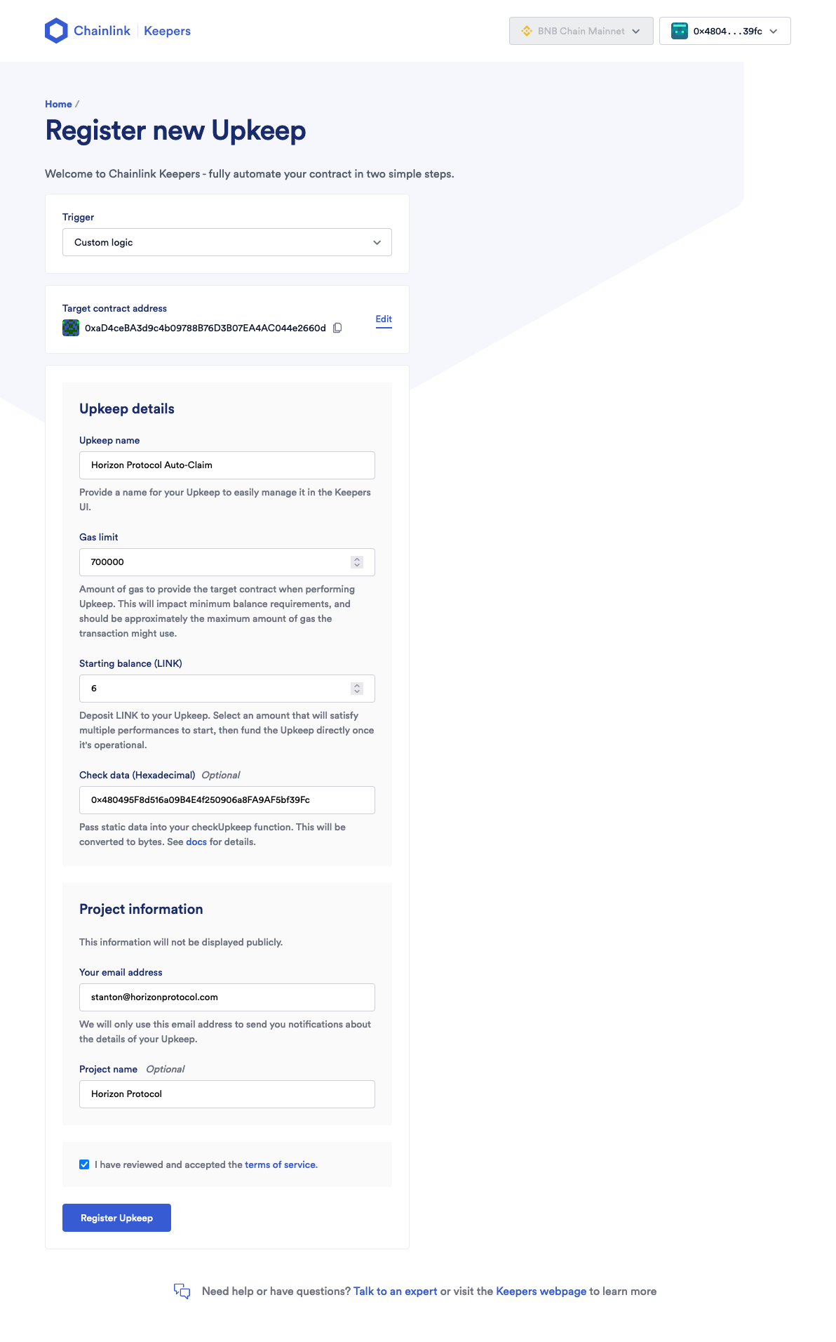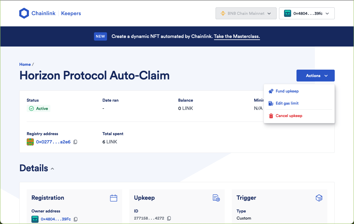 * **Upkeep Name**: Horizon Protocol Auto-Claim\