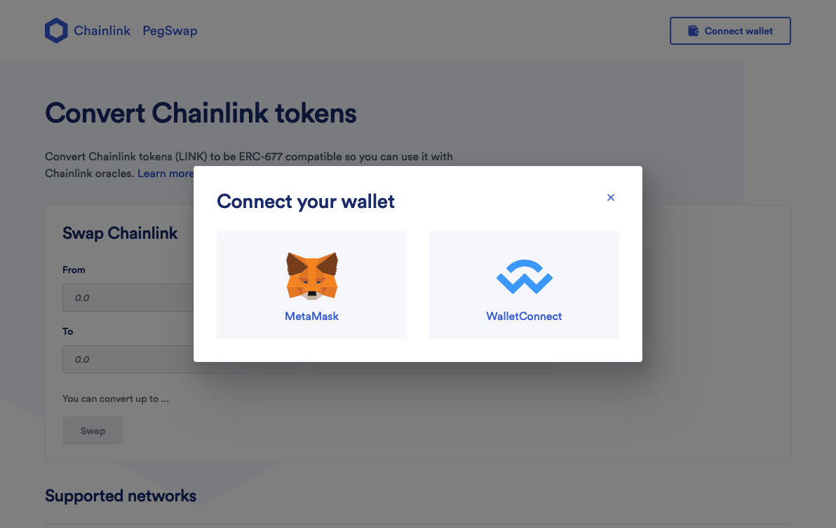 <figure><img src="https://content.gitbook.com/content/BrNnH1lxpRlQwwFmJoqL/blobs/Kqp6rCO2e1hA6bFPoTSx/2_Convert_to_LINK_BEP-677_02.png" alt=""><figcaption><p>When you first get to https://pegswap.chain.link/, you will need to connect your wallet.</p></figcaption></figure>