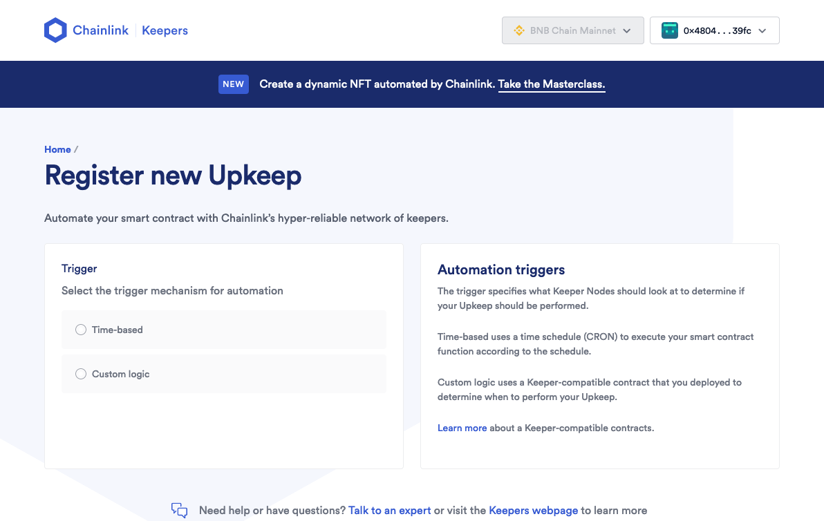 We can start this step by going back to <https://automation.chain.link/bsc>. Make sure your wallet is connected.