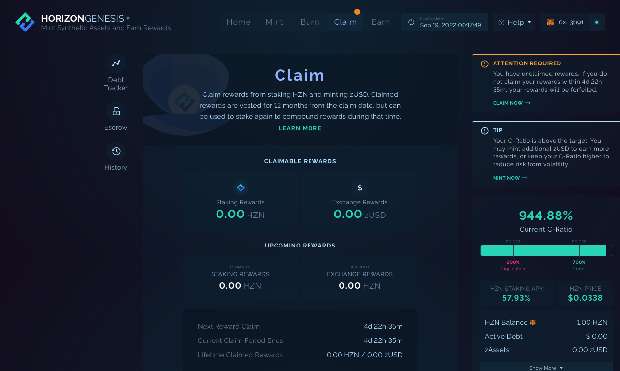 <figure><img src="https://content.gitbook.com/content/BrNnH1lxpRlQwwFmJoqL/blobs/RbvwJWbWyVDfcbZbwTyR/4_Auto_Claim_02.png" alt=""><figcaption><p>And this is what your Claim page will look like after (basically, you didn't click "Claim Now" because your Upkeep claimed for you). Note that the Upkeep can only Claim when you have the proper C-Ratio. The Upkeep currently cannot auto-burn for you.</p></figcaption></figure>