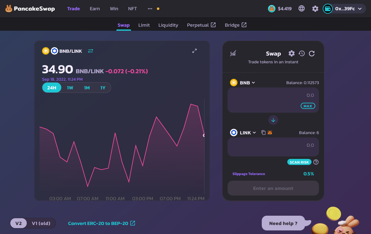 <figure><img src="https://content.gitbook.com/content/BrNnH1lxpRlQwwFmJoqL/blobs/uDhHgrHYSKq9oQFrVxIb/1_Get_LINK_BEP-20_Tokens_11.png" alt=""><figcaption><p>You will now see LINK selected in the Swap section of the page. Enter the amount you want to trade for.</p></figcaption></figure>