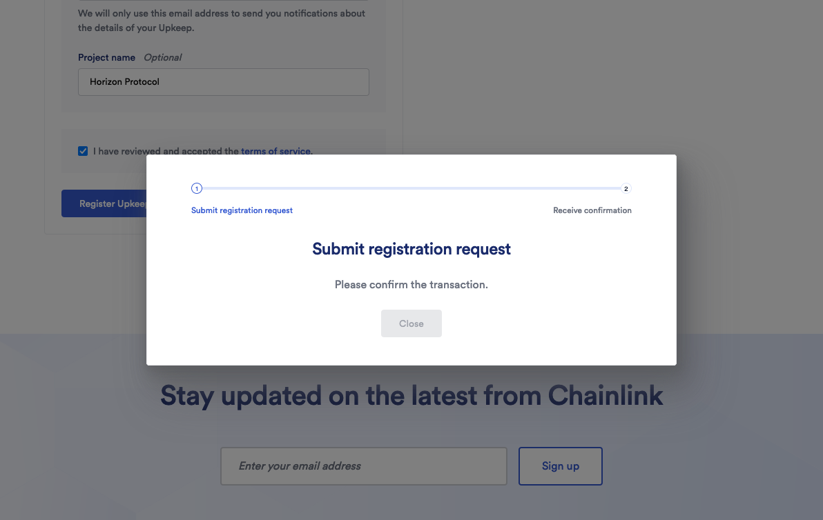 <figure><img src="https://content.gitbook.com/content/BrNnH1lxpRlQwwFmJoqL/blobs/ygbFo928UMsdWOWRC9Uq/3_Register_Keepers_15.png" alt=""><figcaption><p>Once you click "Register Upkeep", the submission will be in process and your MetaMask will prompt you for confirmation.</p></figcaption></figure>