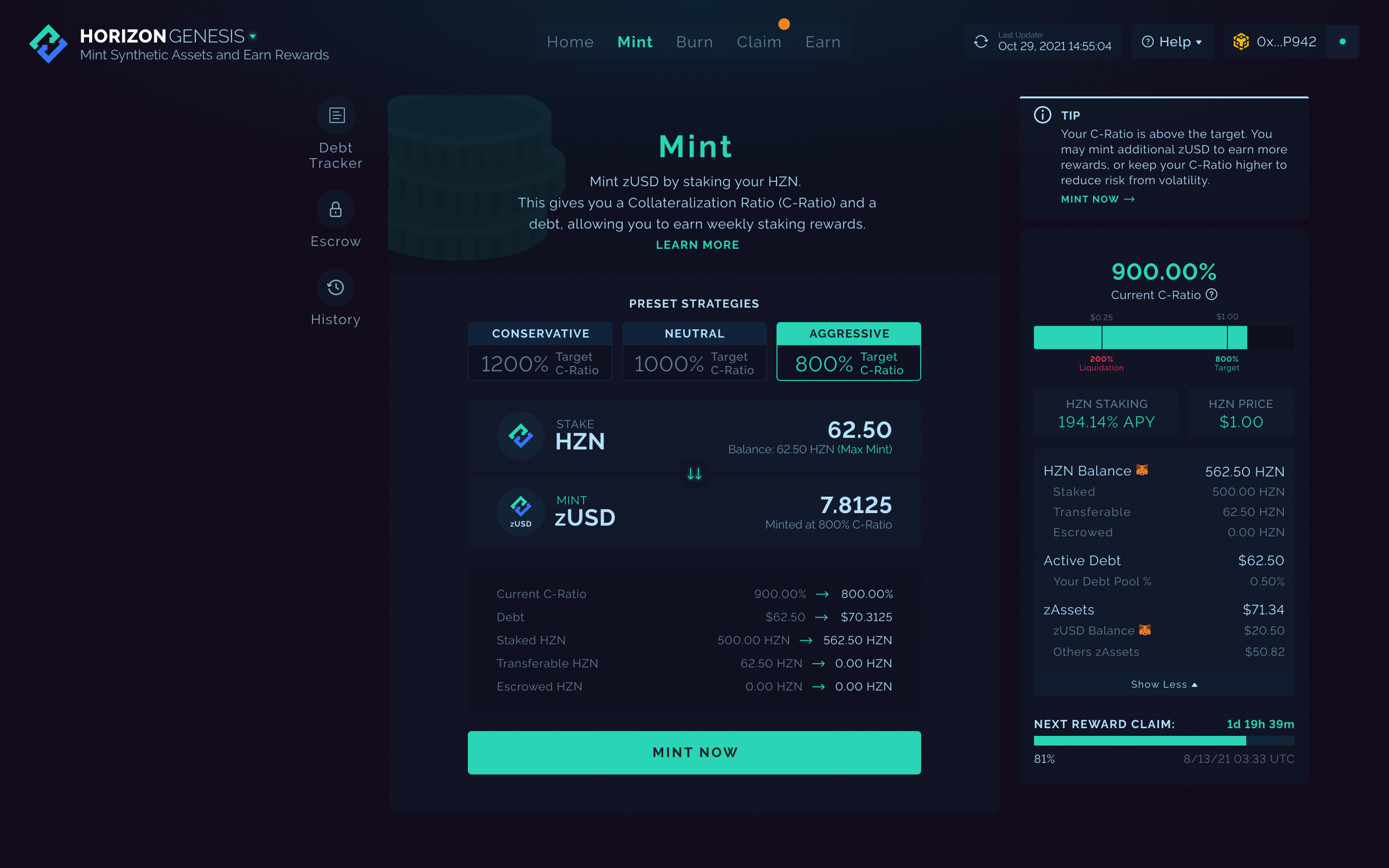 MINT NOW (button) Click to Mint according to the STAKE HZN <-> MINT zUSD details.