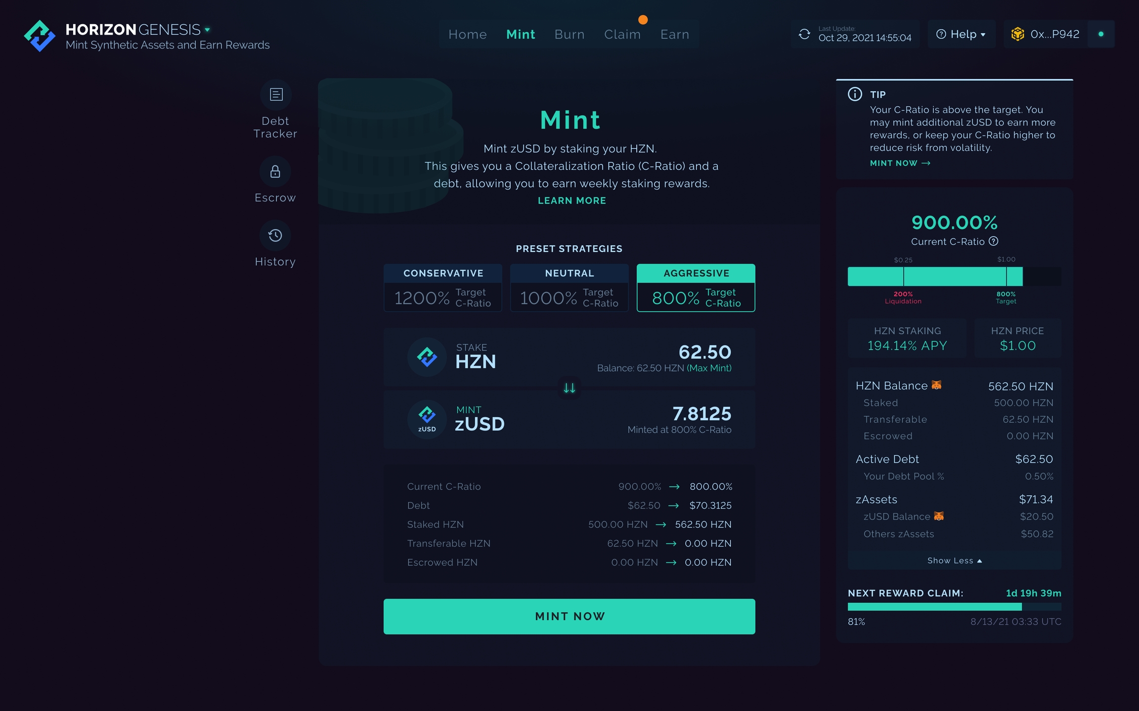 Mint zUSD by staking your HZN. This gives you a Collateralization Ratio (C-Ratio) and a debt, allowing you to earn weekly staking rewards.