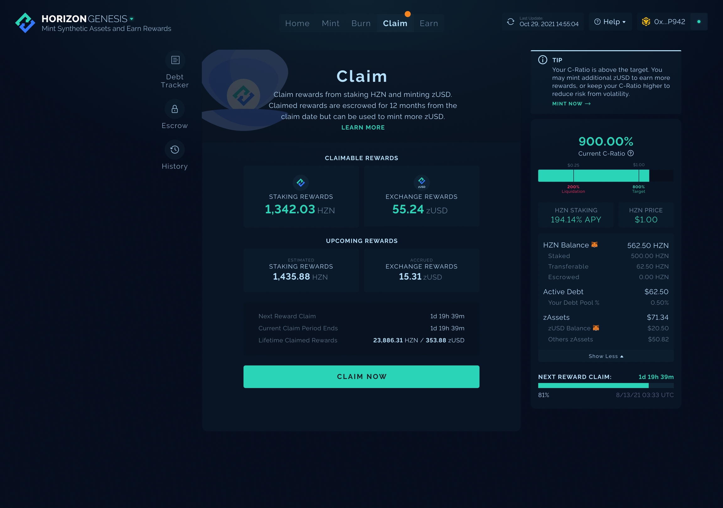 Claim rewards from staking HZN and minting zUSD. Claimed rewards are vested for 12 months from the claim date, but can be used to manage the current C-Ratio or staked again to compound rewards during that time.