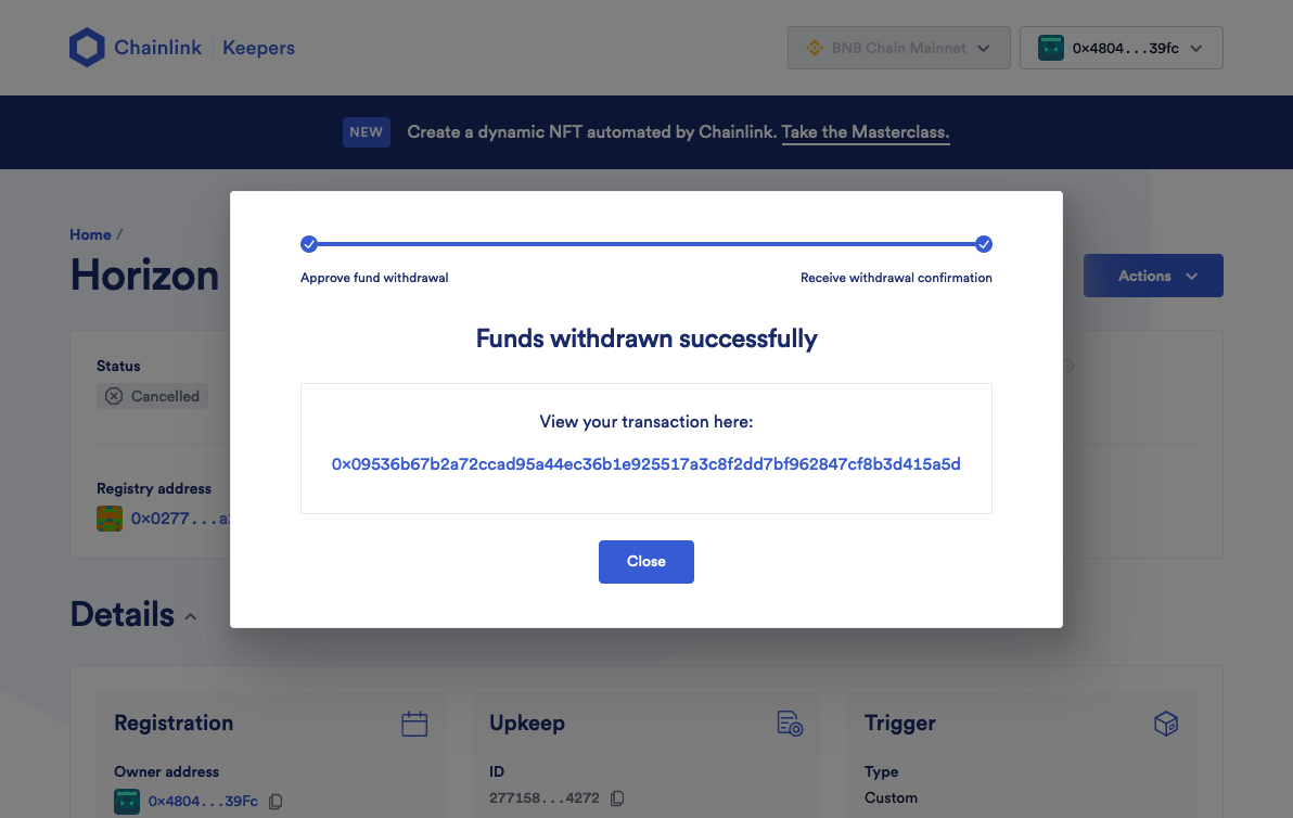 Quá trình Cancel Upkeep và Withdraw Funds sẽ khiến bạn mất một chút token LINK (trong trường hợp này, chúng tôi đã giảm từ 6 -> 5.9).