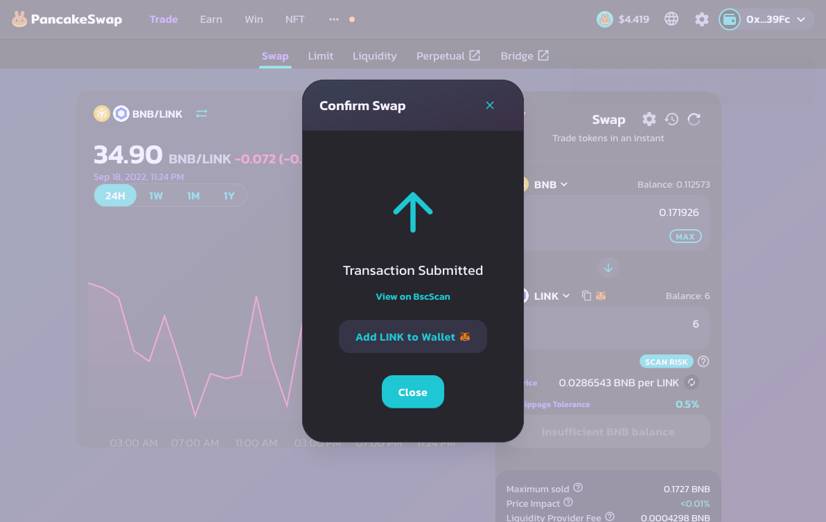 <figure><img src="https://3279929595-files.gitbook.io/~/files/v0/b/gitbook-x-prod.appspot.com/o/spaces%2FkunyBX91B5M85KmSWBnv%2Fuploads%2FIqYSoQb62jrN8e0LsYBp%2F1_Get_LINK_BEP-20_Tokens_08.png?alt=media&#x26;token=86183972-cec1-4766-80b7-805498b39483" alt=""><figcaption><p>Chúng tôi sẽ giao dịch 6 LINK với BNB.</p></figcaption></figure>