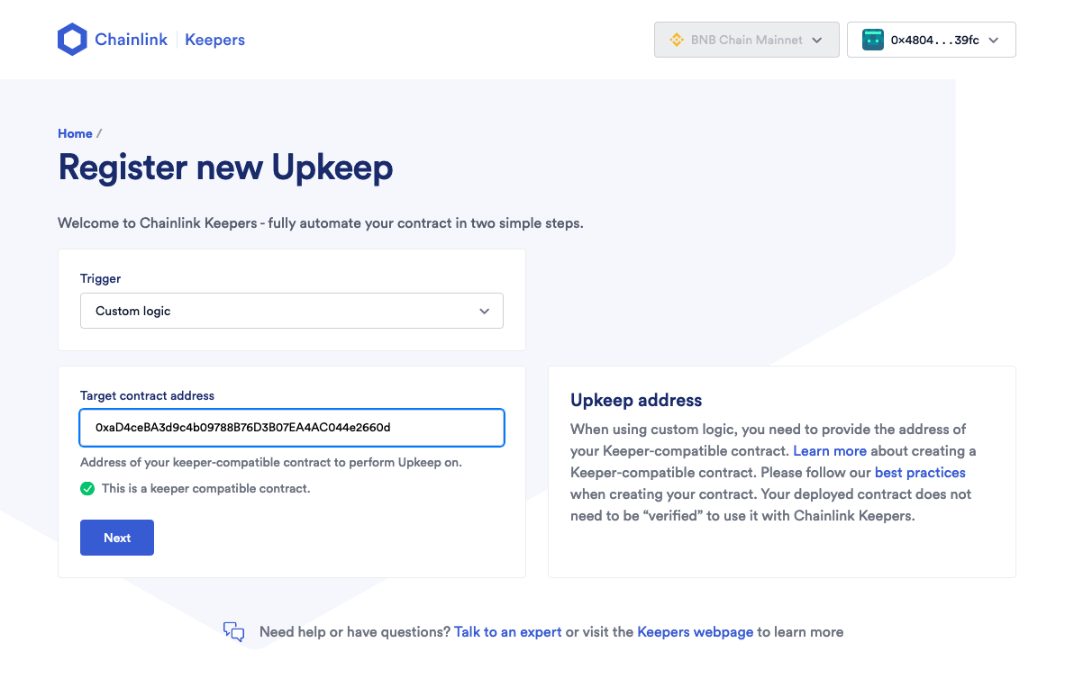 Chúng ta có thể bắt đầu bước này bằng cách quay lại <https://automation.chain.link/bsc>. Đảm bảo ví của bạn được kết nối