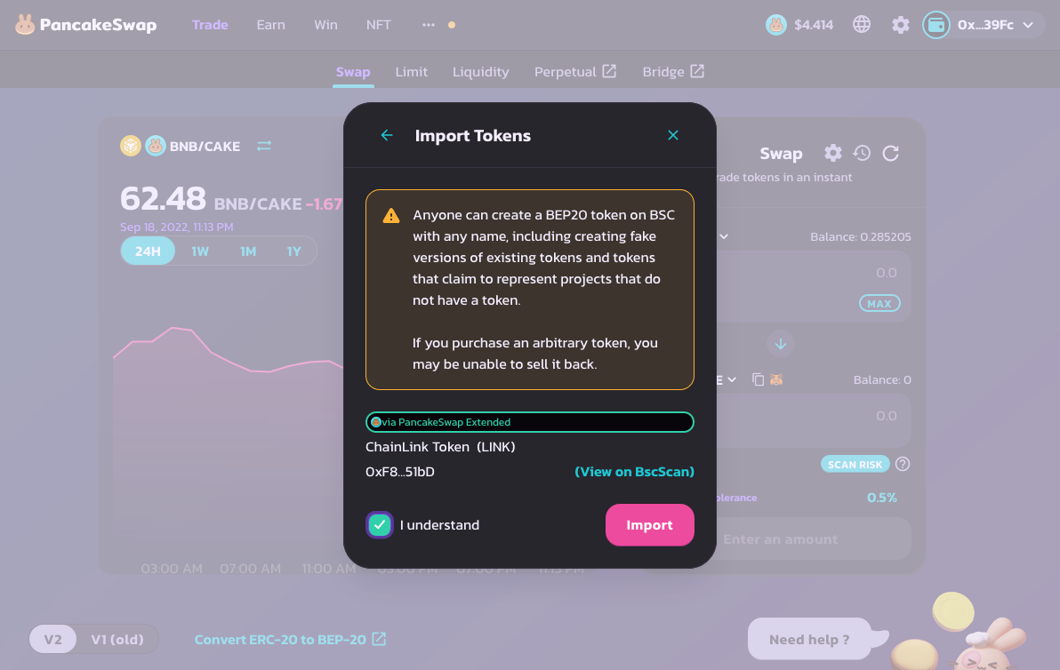 <figure><img src="https://3279929595-files.gitbook.io/~/files/v0/b/gitbook-x-prod.appspot.com/o/spaces%2FkunyBX91B5M85KmSWBnv%2Fuploads%2FOtq7f3lvtB7SSffJ7l0t%2F1_Get_LINK_BEP-20_Tokens_05.png?alt=media&#x26;token=4e16eb6d-95c0-4f24-82e5-651197b7ef7e" alt=""><figcaption><p>Sau khi nhấp vào Import, bạn sẽ thấy điều này. Kiểm tra "I Understand" và sau đó nhấp vào "Import".</p></figcaption></figure>